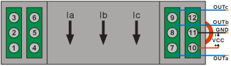 Hole-thru current input; Terminals 7,8,9,and 11 are for output,and terminals 10 and 11 are for power supply, and terminal 11 is GNB. Terminal 1-6 and 12 are NC (No Connection)